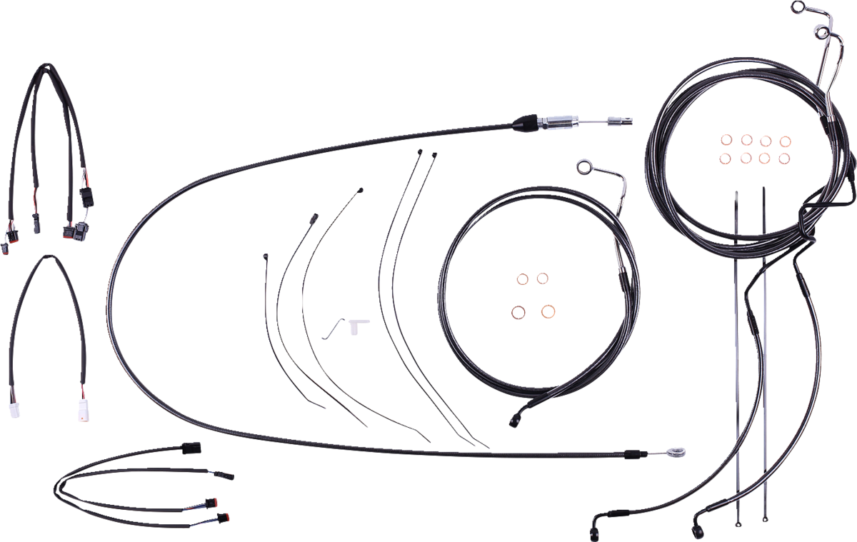 - Kit includes throttle and idle cables of throttle-by-wire extensions, clutch cable or hydraulic clutch line, brake lines, copper crush washers, hardware, and any necessary switch wiring of turn signal extension, unless otherwise noted