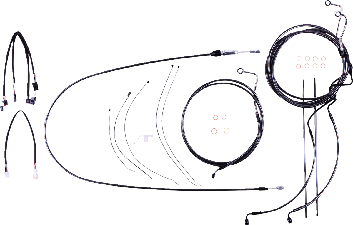 - Kit includes throttle and idle cables of throttle-by-wire extensions, clutch cable or hydraulic clutch line, brake lines, copper crush washers, hardware, and any necessary switch wiring of turn signal extension, unless otherwise noted