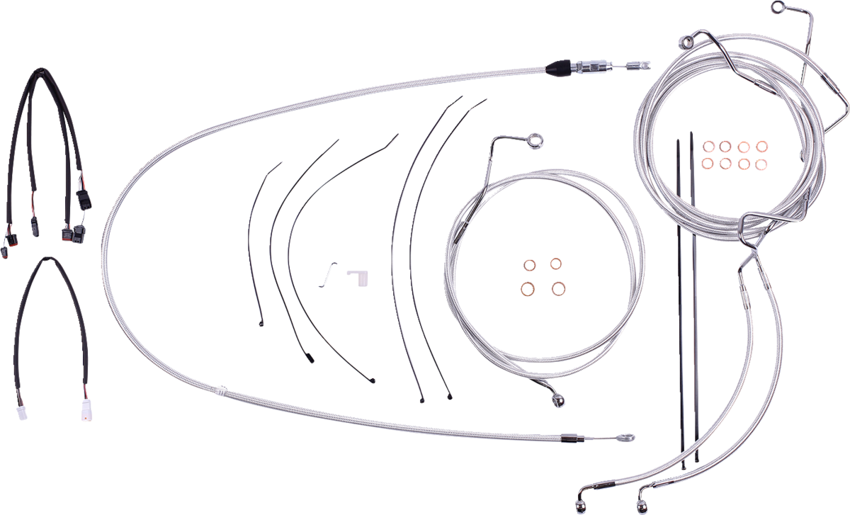 - Kit includes throttle and idle cables of throttle-by-wire extensions, clutch cable or hydraulic clutch line, brake lines, copper crush washers, hardware, and any necessary switch wiring of turn signal extension
