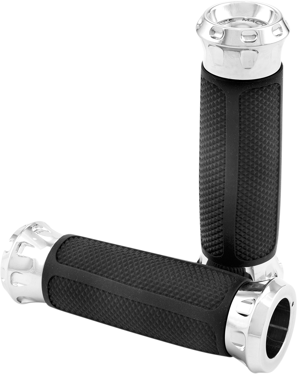 - Durable, knurled rubber sleeves with an embossed PM logo wrapped around machined billet grips