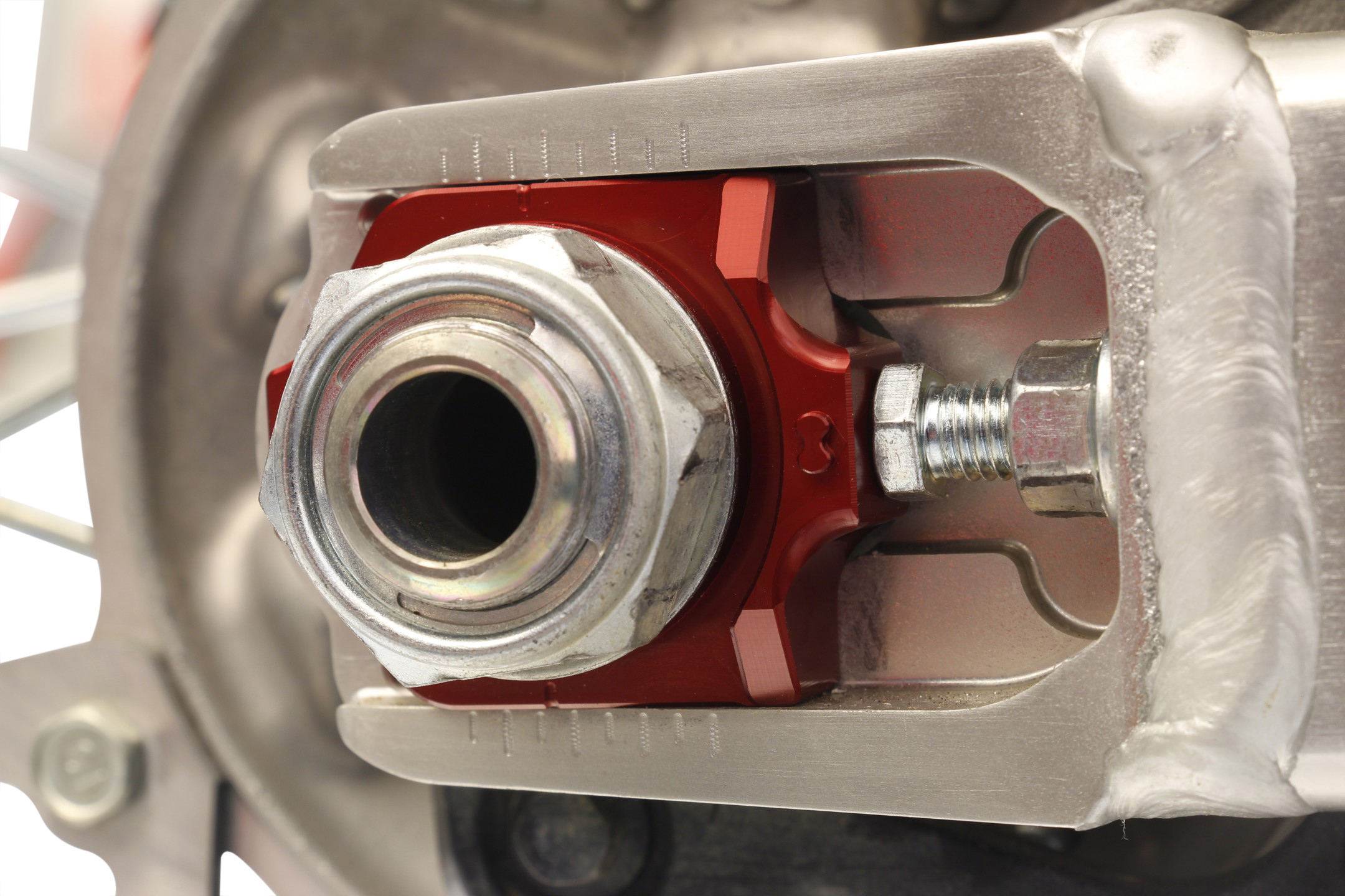 Consisting of a pair of CNC’d Elite axle blocks, a titanium drive-side receiver and a square removal tool nut, the Elite Axle Block Kit converts your stock Off-Road or Dual Sport model’s rear axle from a fixed design into a floating type. Factory teams use this same floating type design on their race team bikes to improve traction as well as straight line stability and now those same benefits are available from this kit. Another key component is the integrated receiver post on each axle block that allows the use of a caliper to precisely measure and match the left and right axle block’s position. This assures exact alignment of the chain and sprocket so critical to prolonging chain and sprocket life.