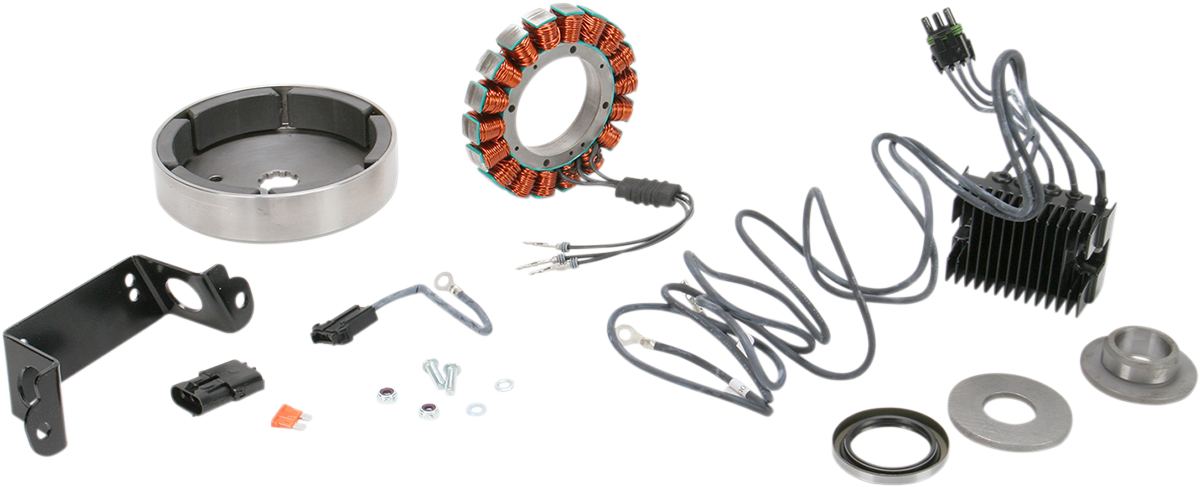 - Unique narrow rotor and stator fit into Softail/Dyna/FLT primary cases as used by most custom builders and the voltage regulator bolts on the stock location without any frame modifications