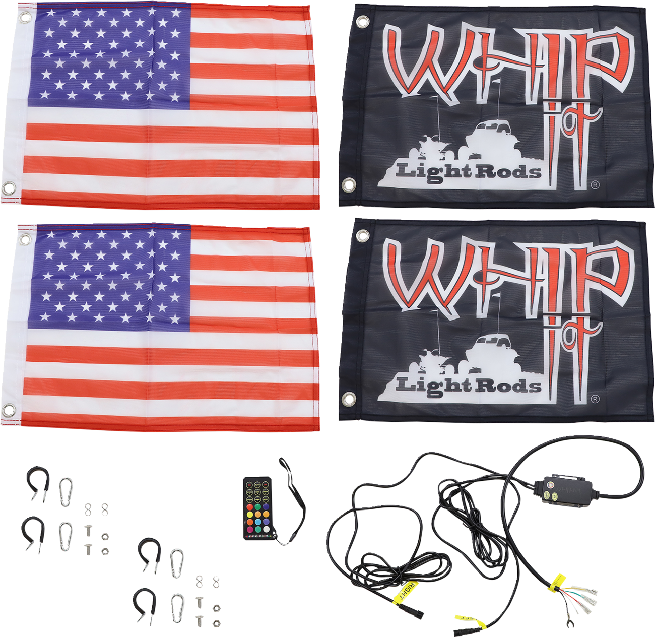 - Includes remote, wiring harness, Black Whip It flag, American Flag and hardware