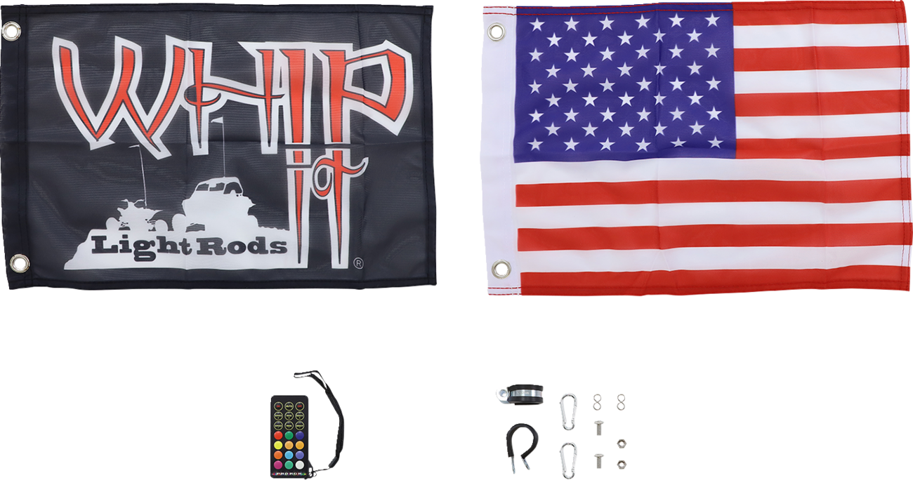 - Includes remote, wiring harness, Black Whip It flag, American Flag and hardware