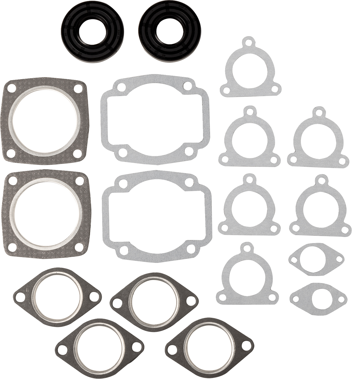- Includes all head, base, intake, exhaust gaskets and O-rings or oil seals, plus crankshaft end seals and power valve gaskets