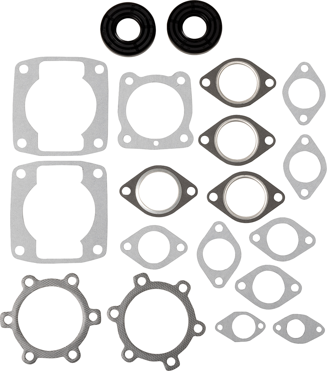 - Includes all head, base, intake, exhaust gaskets and O-rings or oil seals, plus crankshaft end seals and power valve gaskets