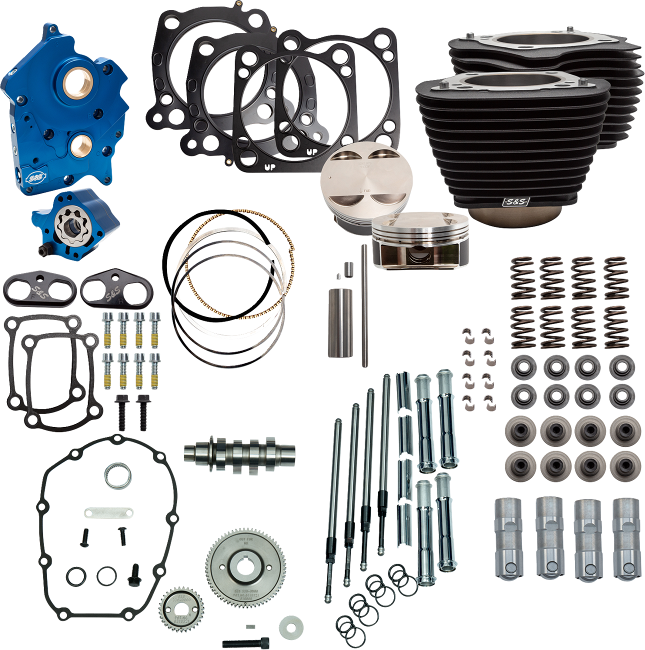 - Includes oil pump/cam plate, pushrods with chrome covers, tappets, tappet cuffs, S&S 550 camshaft, and valve springs