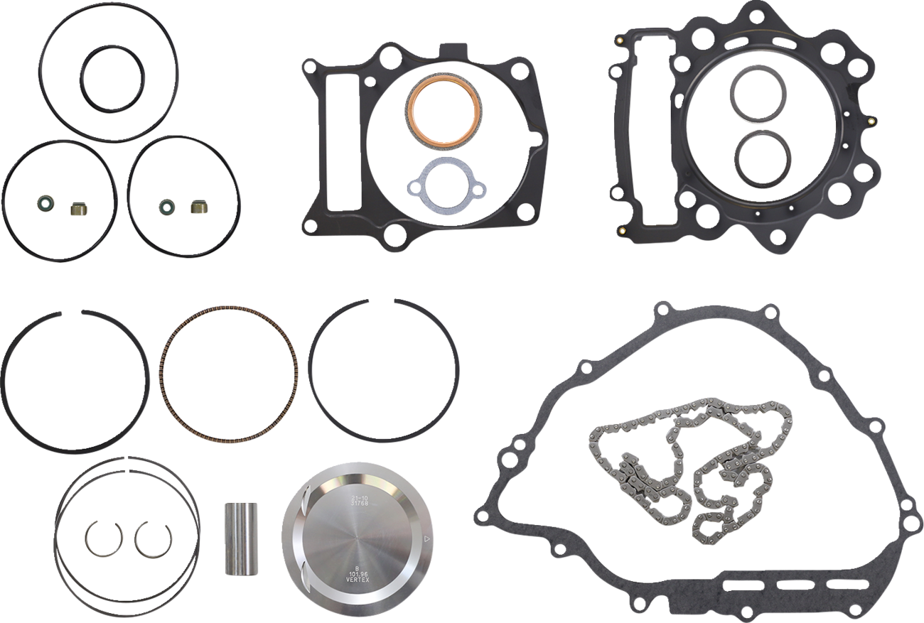 - Top end kit includes piston, rings, pins, circlips, top end gaskets and cam chain