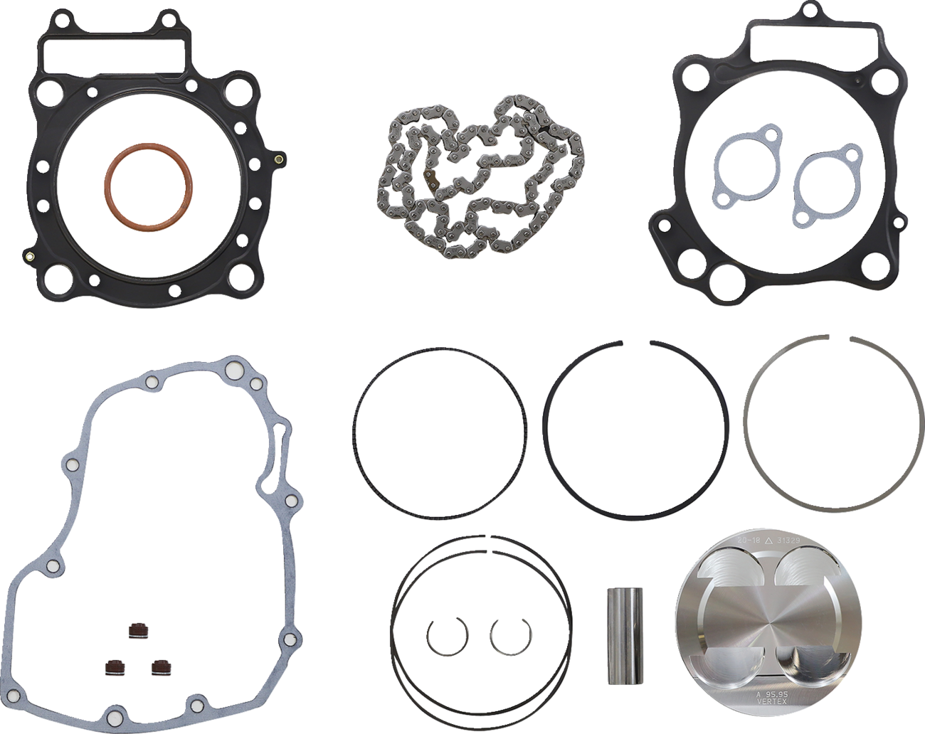 - Top end kit includes piston, rings, pins, circlips, top end gaskets and cam chain