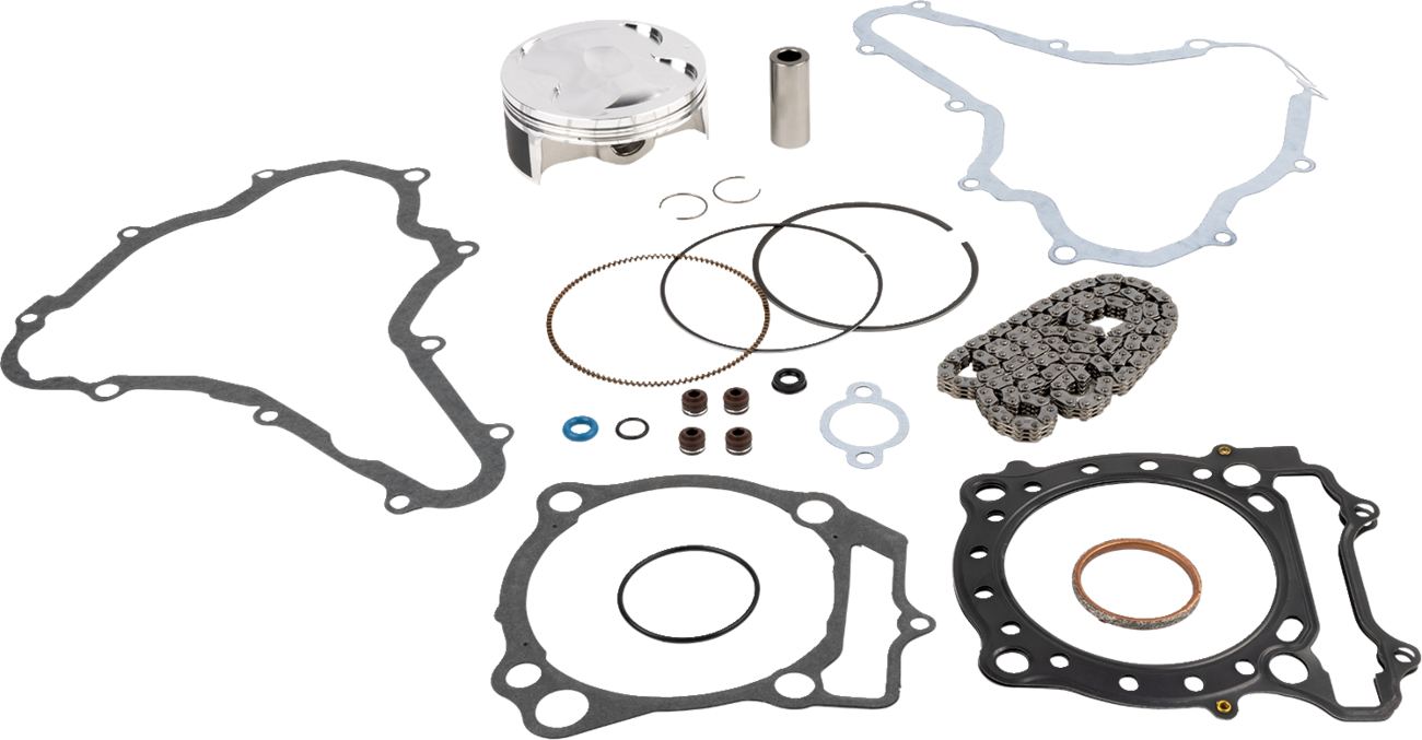 - Top end piston kit includes piston, rings, pins, circlips, top end gaskets, and cam chain