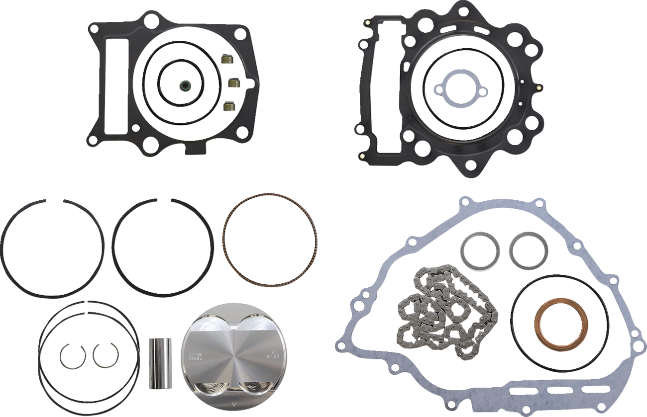 - Top end piston kit includes piston, rings, pins, circlips, top end gaskets, and cam chain
