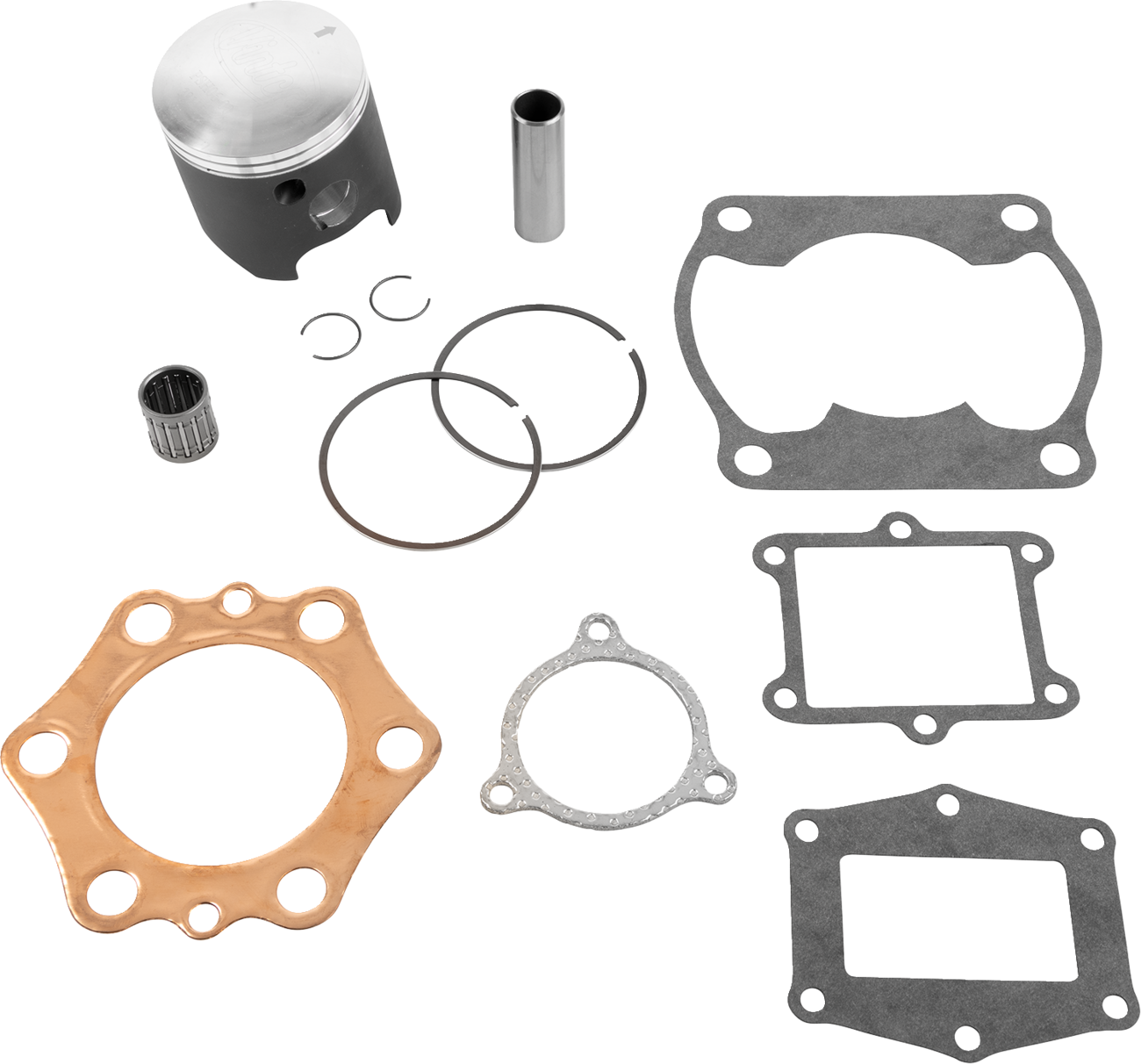 - Kit includes a piston, rings, pin and clips, top end bearing and a full top-end gasket kit (head gasket, base gasket, intake gasket, and exhaust gasket)