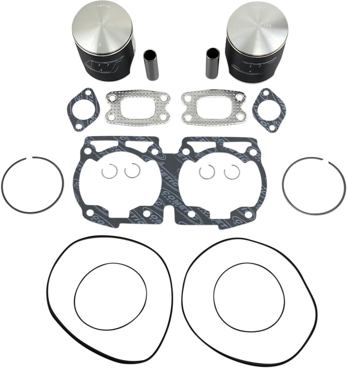 - Kit includes forged pistons, rings, wrist pins, circlips and top end gasket set