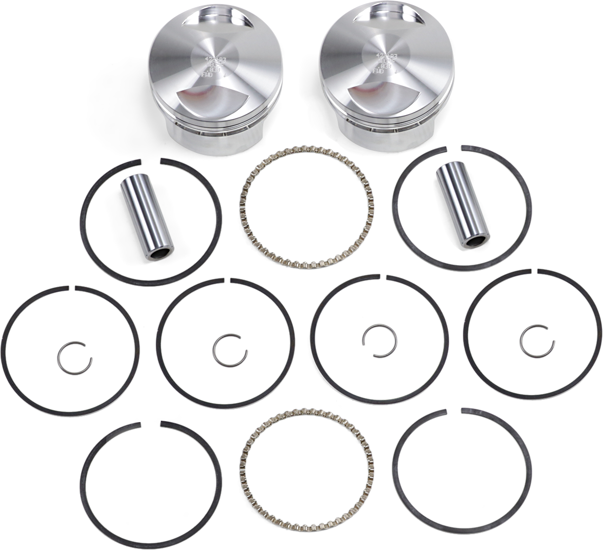 • Kit Includes pistons, rings, retainer clips and chrome piston pins