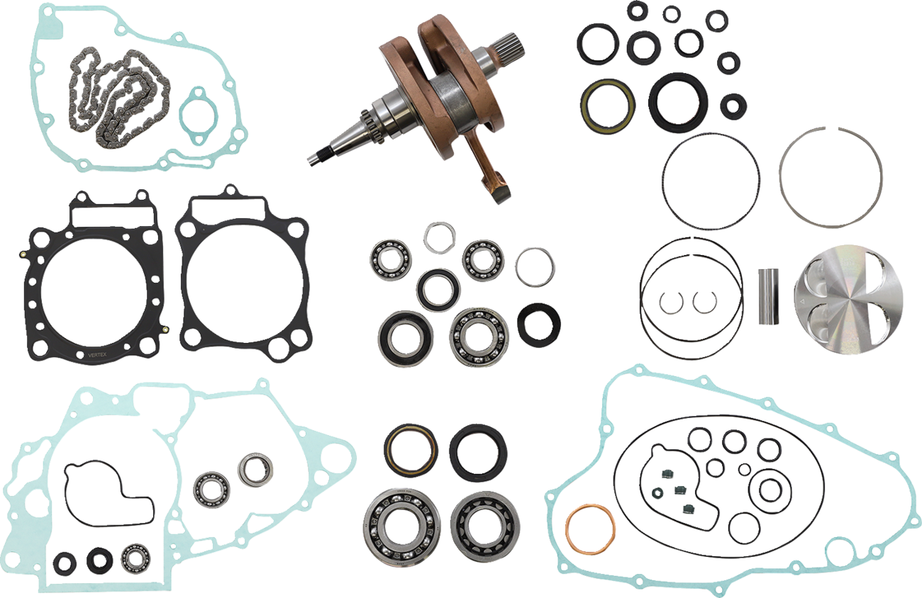 - Includes crankshaft, piston kit, complete engine gasket kit with oil seals, main bearings and seals, water pump rebuild kit, transmission bearings, countershaft bushing/seal kit, cam chain and counter balancer bearings when applicable