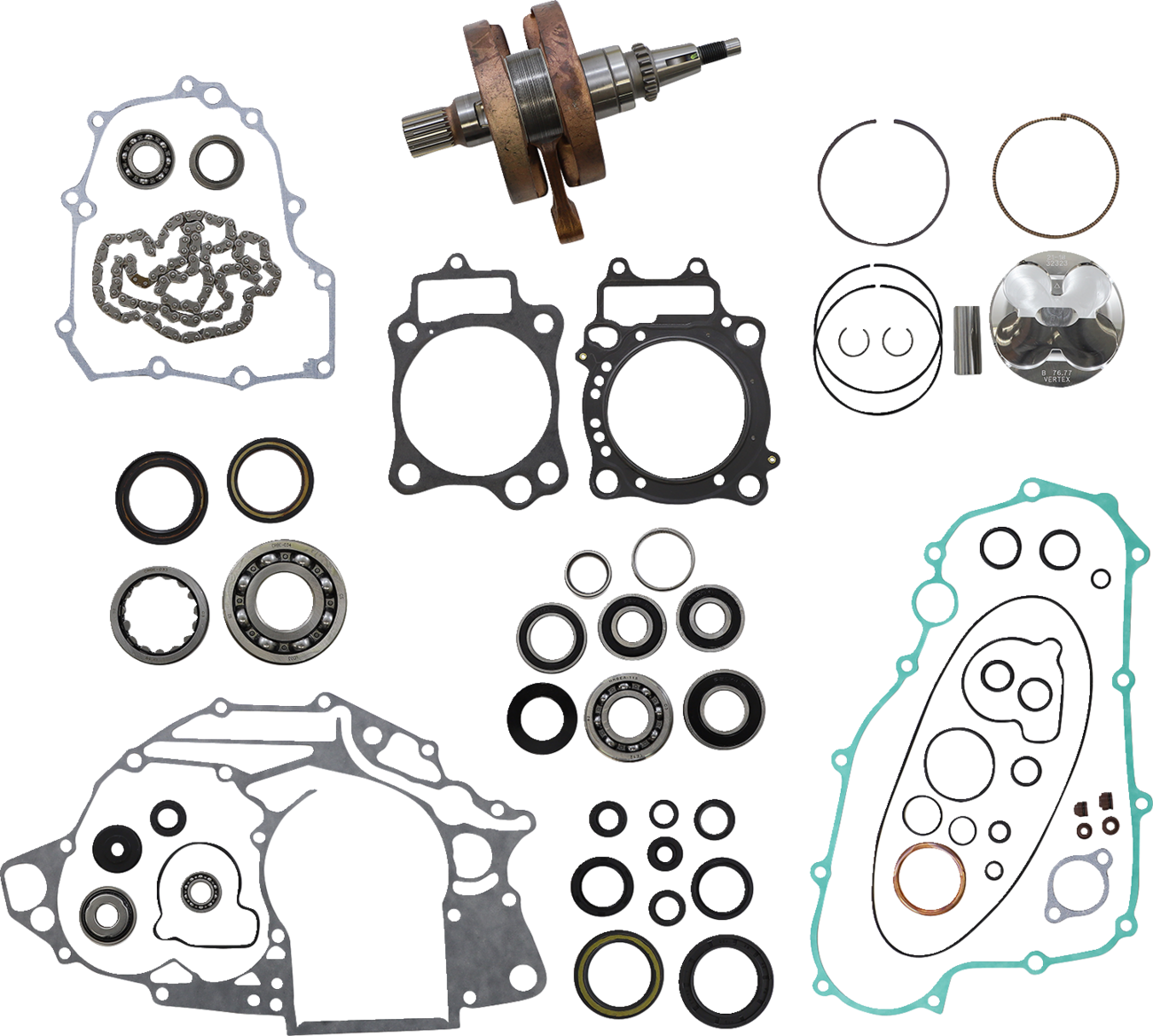 - Includes crankshaft, piston kit, complete engine gasket kit with oil seals, main bearings and seals, water pump rebuild kit, transmission bearings, countershaft bushing/seal kit, cam chain and counter balancer bearings when applicable