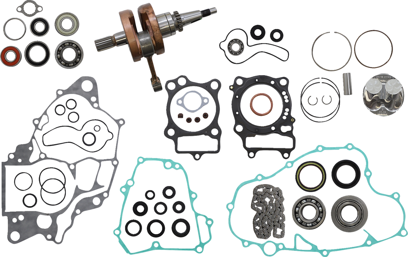 - Includes crankshaft, piston kit, complete engine gasket kit with oil seals, main bearings and seals, water pump rebuild kit, transmission bearings, countershaft bushing/seal kit, cam chain and counter balancer bearings when applicable