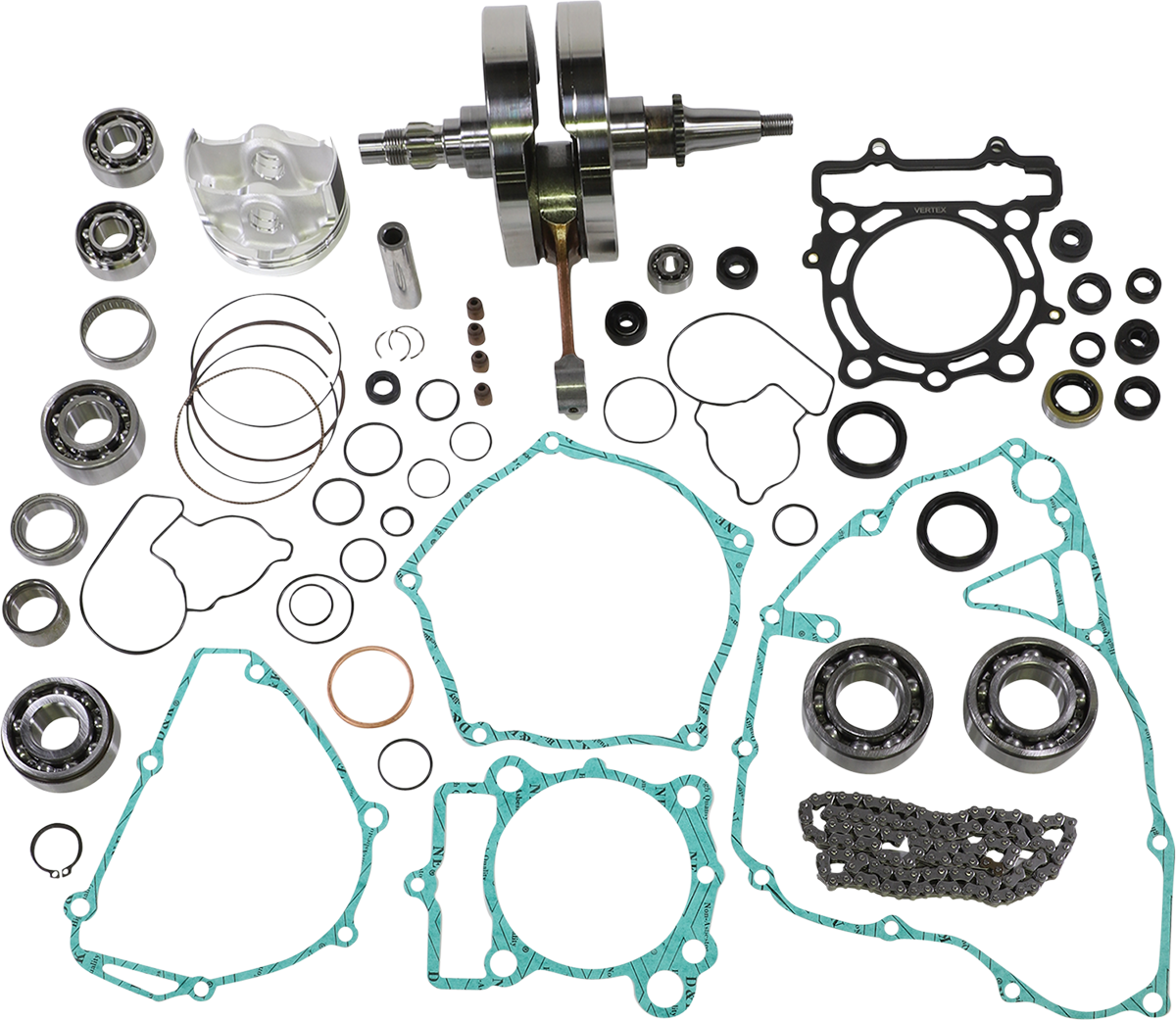 - Includes crankshaft, piston kit, complete engine gasket kit with oil seals, main bearings and seals, water pump rebuild kit, transmission bearings, countershaft bushing/seal kit, cam chain and counter balancer bearings when applicable