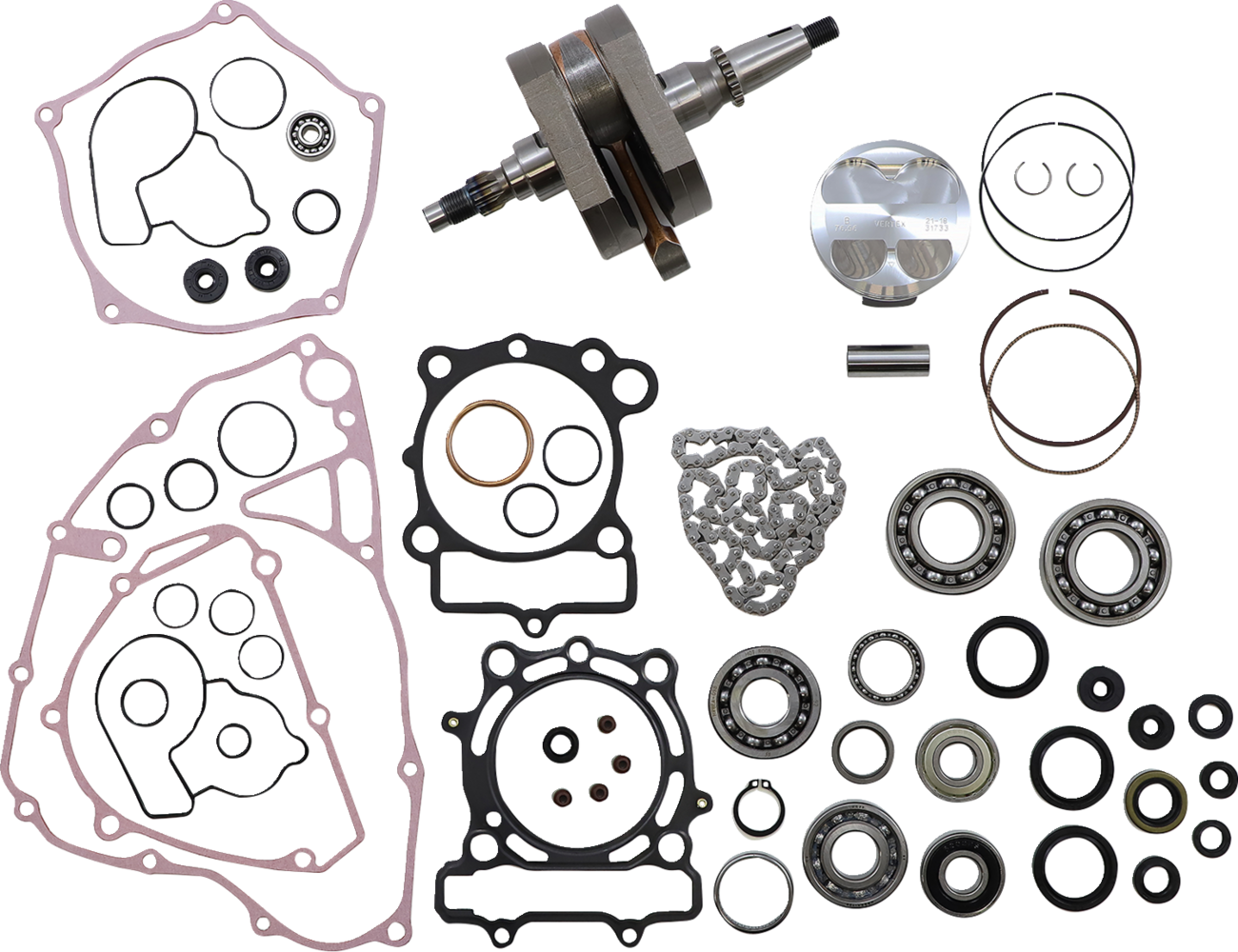 - Includes crankshaft, piston kit, complete engine gasket kit with oil seals, main bearings and seals, water pump rebuild kit, transmission bearings, countershaft bushing/seal kit, cam chain and counter balancer bearings when applicable