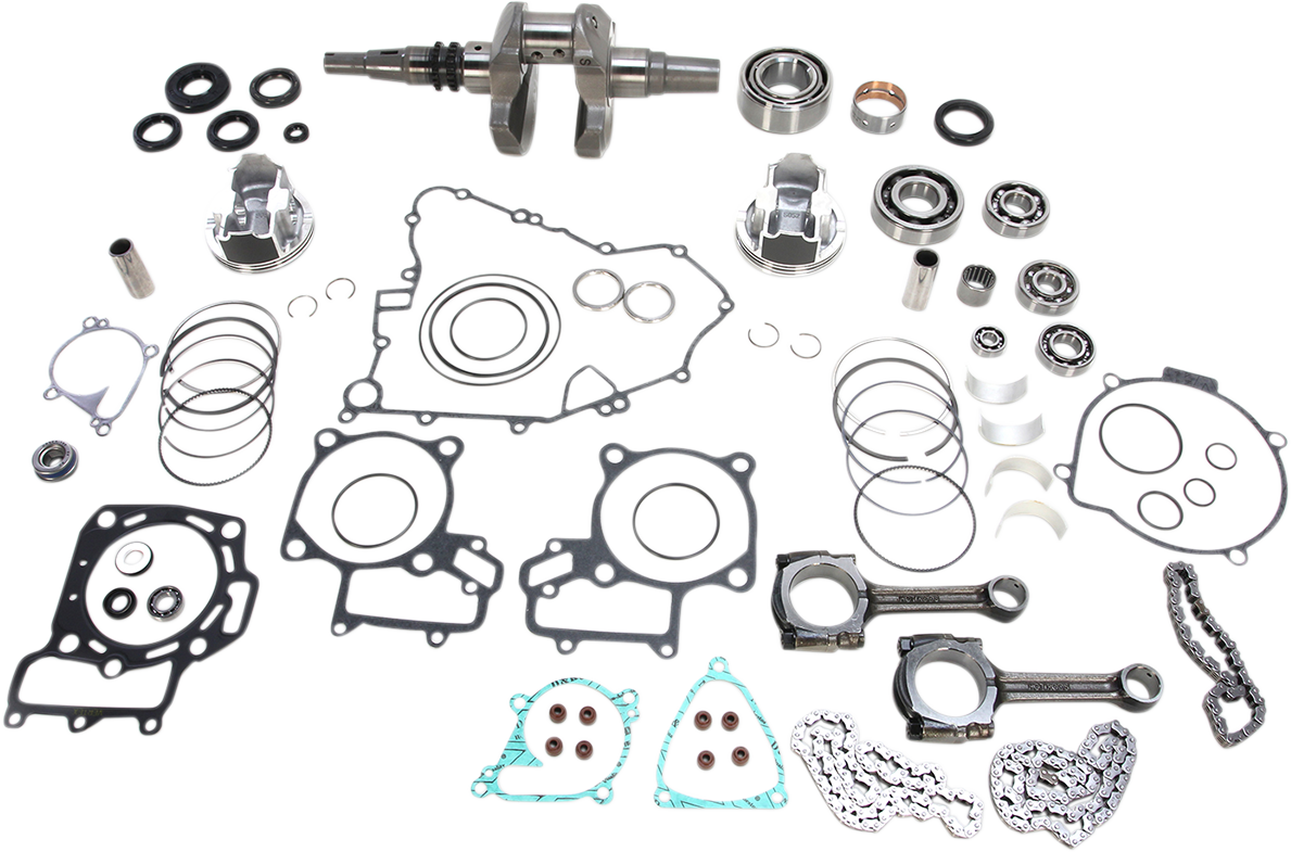 - Includes crankshaft, piston kit, complete engine gasket kit with oil seals, main bearings and seals, water pump rebuild kit, transmission bearings, countershaft bushing/seal kit, cam chain and counter balancer bearings when applicable