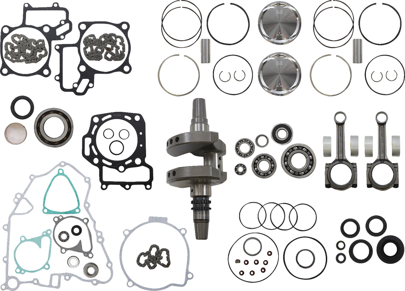 - Includes crankshaft, piston kit, complete engine gasket kit with oil seals, main bearings and seals, water pump rebuild kit, transmission bearings, countershaft bushing/seal kit, cam chain and counter balancer bearings when applicable