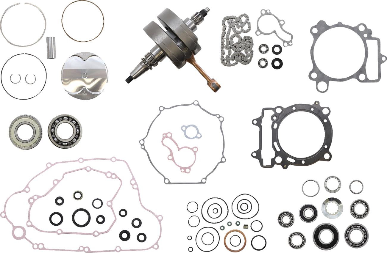 - Includes crankshaft, piston kit, complete engine gasket kit with oil seals, main bearings and seals, water pump rebuild kit, transmission bearings, countershaft bushing/seal kit, cam chain and counter balancer bearings when applicable