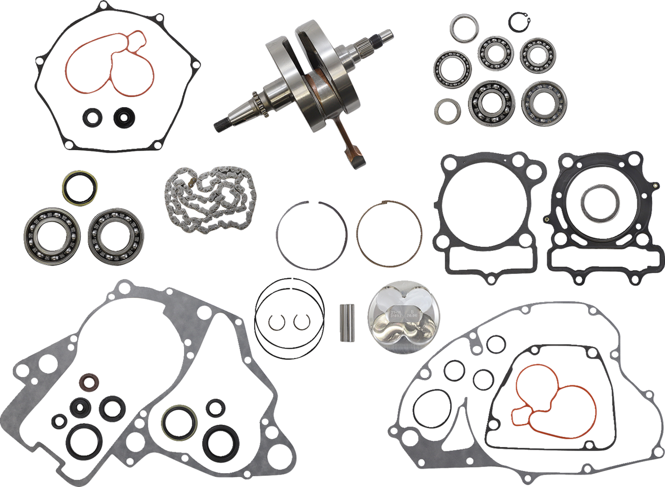 - Includes crankshaft, piston kit, complete engine gasket kit with oil seals, main bearings and seals, water pump rebuild kit, transmission bearings, countershaft bushing/seal kit, cam chain and counter balancer bearings when applicable