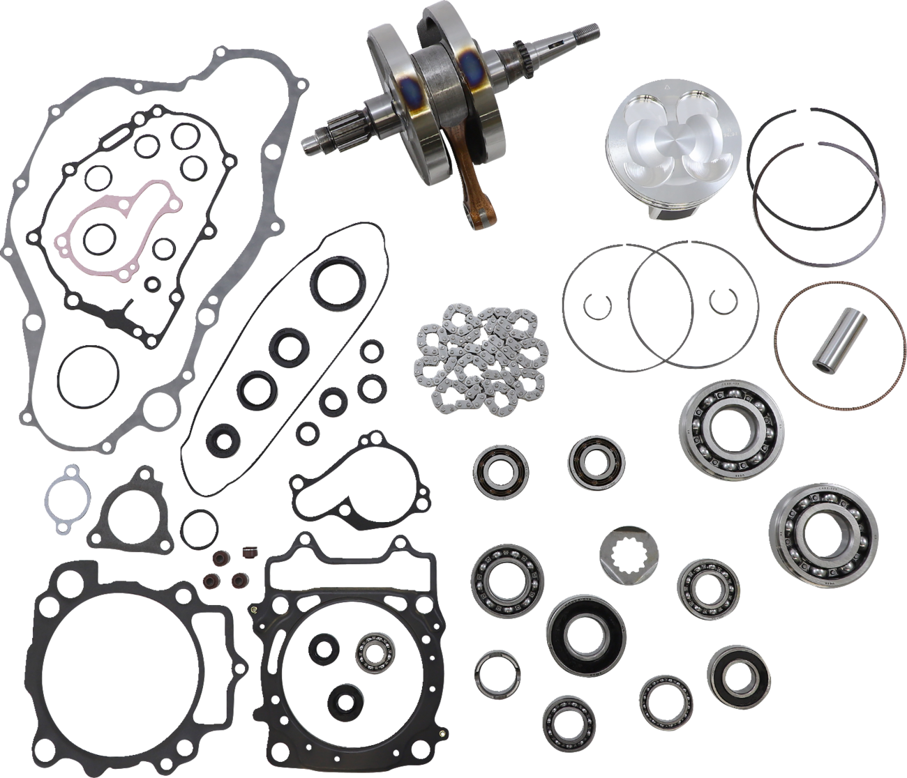 - Includes crankshaft, piston kit, complete engine gasket kit with oil seals, main bearings and seals, water pump rebuild kit, transmission bearings, countershaft bushing/seal kit, cam chain and counter balancer bearings when applicable