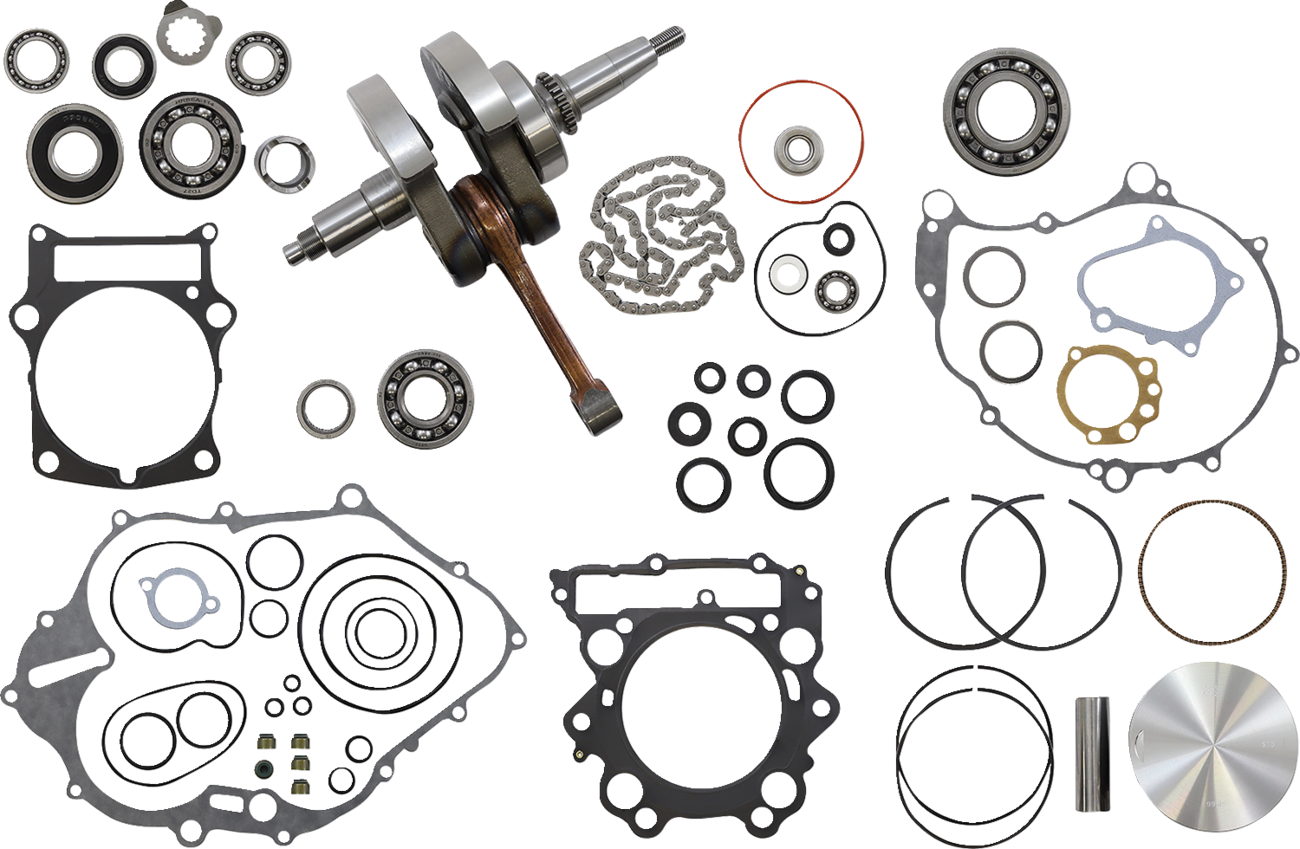 - Includes crankshaft, piston kit, complete engine gasket kit with oil seals, main bearings and seals, water pump rebuild kit, transmission bearings, countershaft bushing/seal kit, cam chain and counter balancer bearings when applicable