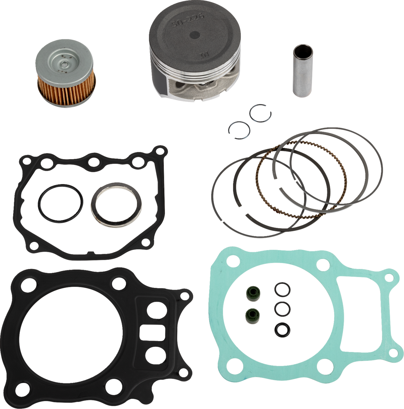 - Includes pistons, rings, pins, clips, head and base gaskets and intake and exhaust gaskets and oil filter for 4-stroke models