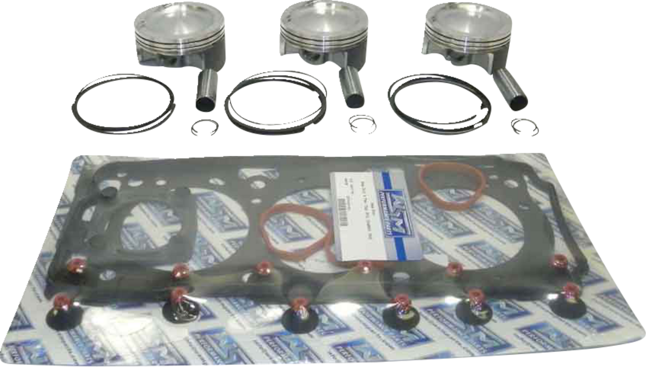 - Includes pistons, rings, pins, clips, racing needle bearings, head and base gaskets, intake and exhaust gaskets