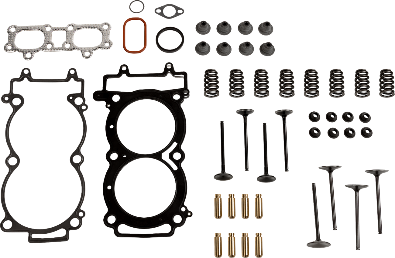 - Kit includes complete top end gasket kit, full set of KPMI® standard valves, high performance titanium spring kit, complete set of valve guides, and Viton® valve stem seals