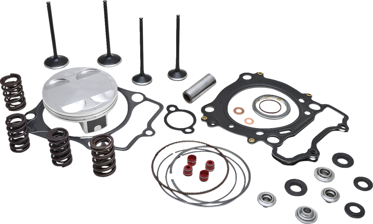 - Kit includes all necessary parts for a complete top-end service/rebuild: pistons, piston rings, piston pins, gaskets, valves, and valve springs