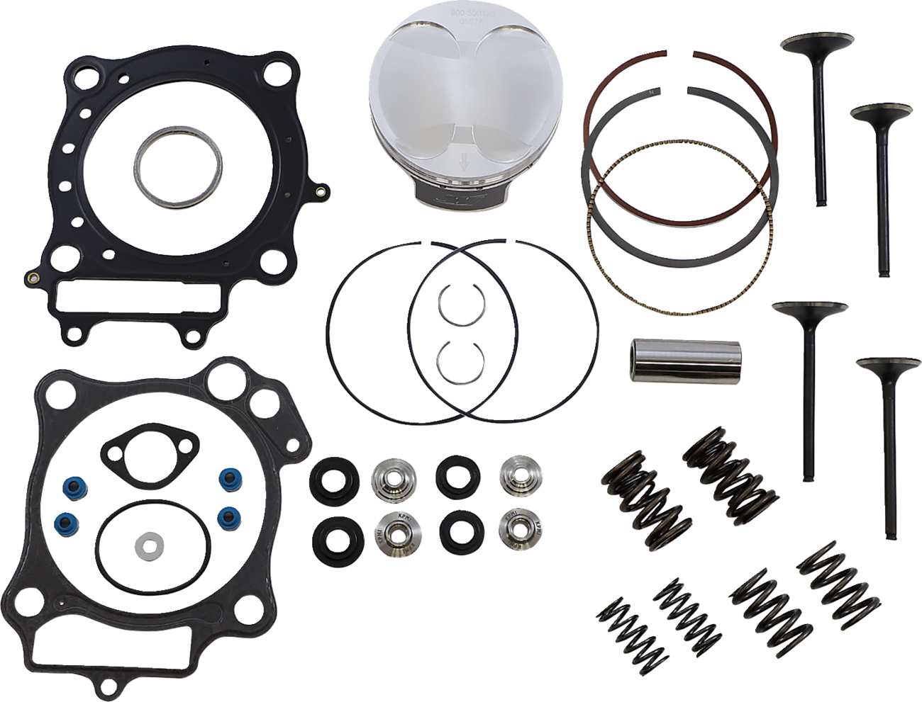 - Kit includes all necessary parts for a complete top-end service/rebuild: pistons, piston rings, piston pins, gaskets, valves, and valve springs