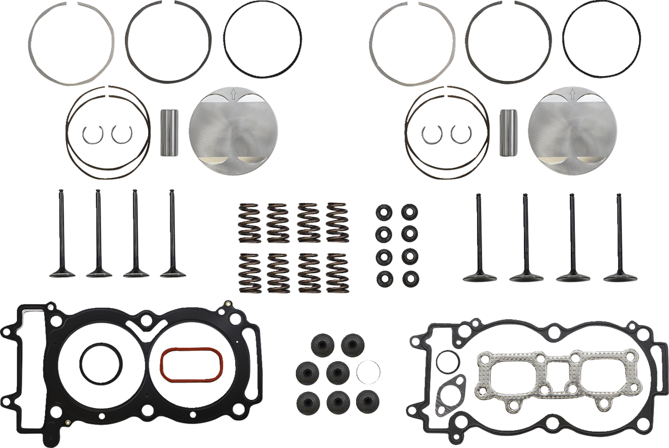 - Kit includes all necessary parts for a complete top-end service/rebuild: pistons, piston rings, piston pins, gaskets, valves, and valve springs