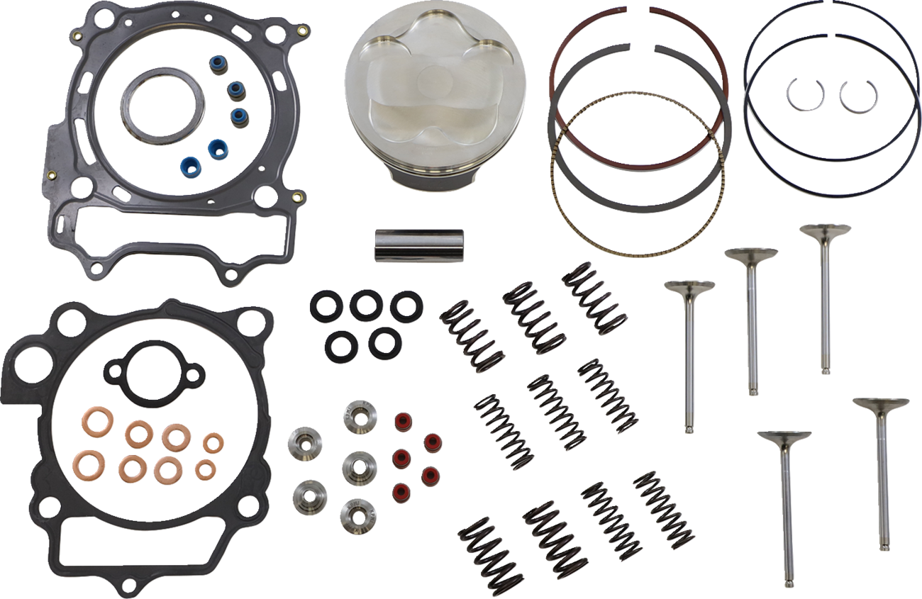 - Kit includes all necessary parts for a complete top-end service/rebuild: pistons, piston rings, piston pins, gaskets, valves, and valve springs
