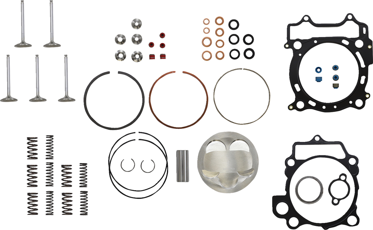 - Kit includes all necessary parts for a complete top-end service/rebuild: pistons, piston rings, piston pins, gaskets, valves, and valve springs