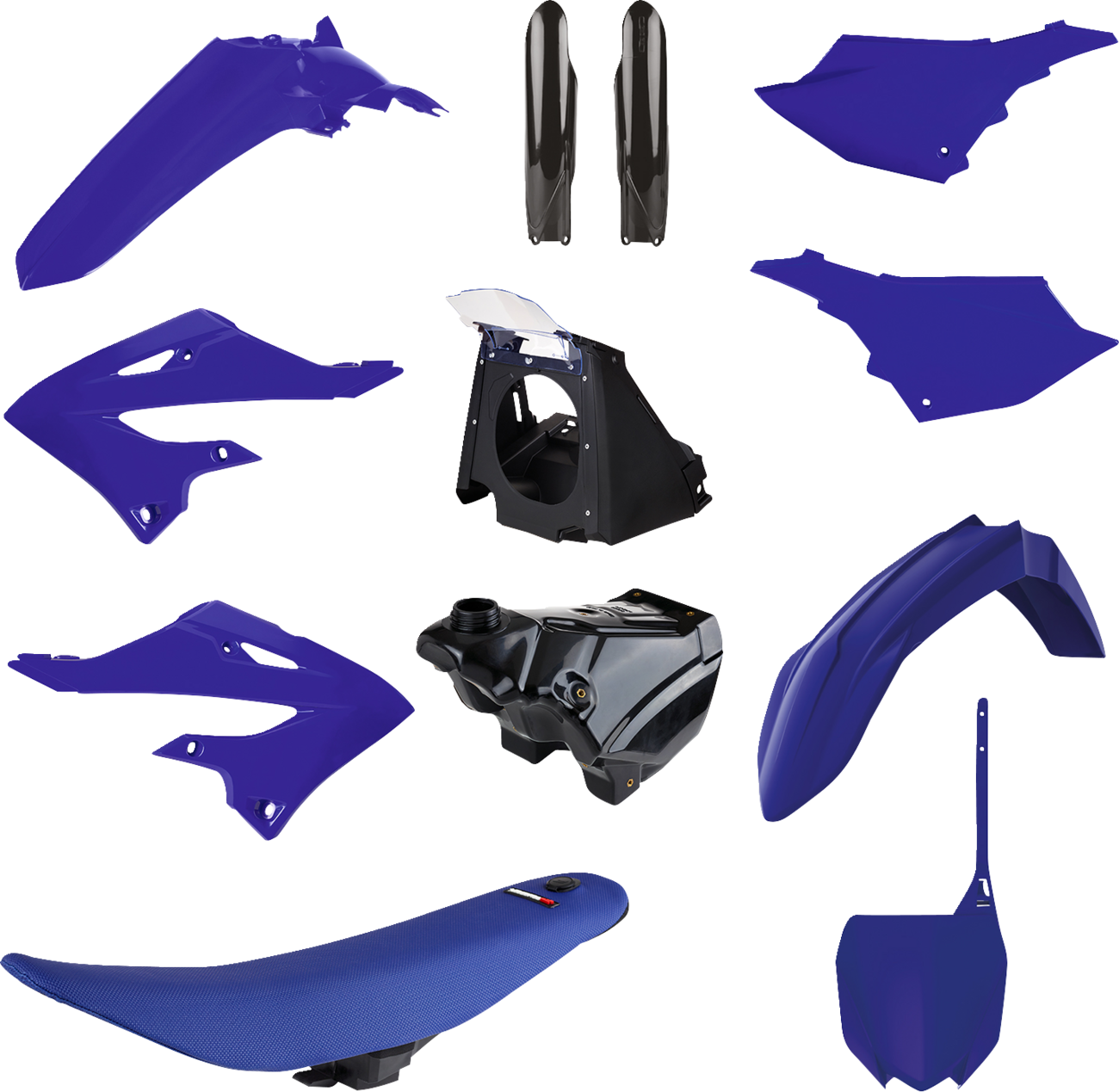 - Full kit includes front fender, front number plate, lower fork cover set, radiator shrouds, side panels, and rear fender