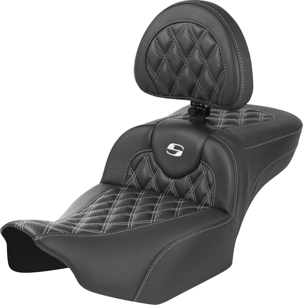 SADDLEMEN Roadsofa™ Extended Reach Seat – with Backrest – Lattice Stitch – White Stitch – FLTR/FLHX ’23-’24