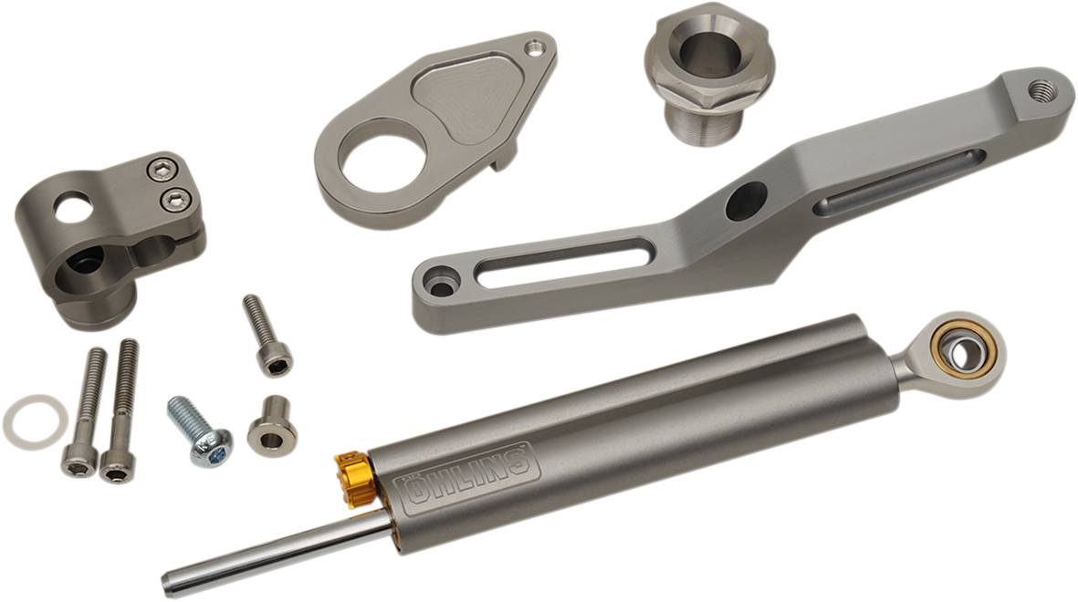 - Öhlins steering damper kits for specific bike models come with all necessary mounting hardware