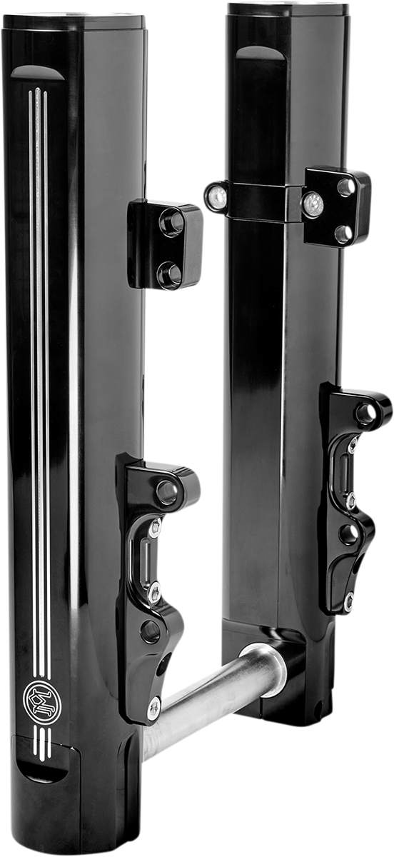 - Machined PM icon logo with a pinstripe detail that extends the length of the fork legs, and a hidden-axle design