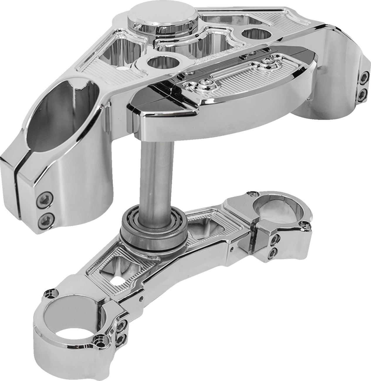 - Complete triple tree kit CNC-machined from billet aluminum featuring a drop design