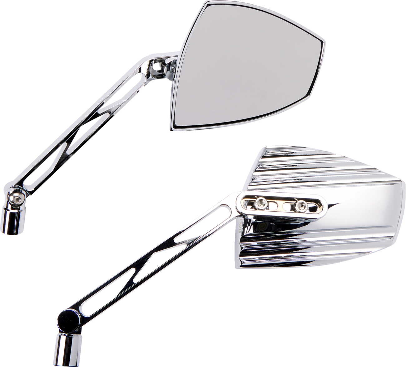 - Asymmetrical shape and CNC milled lines of the mirror head create an industrial look