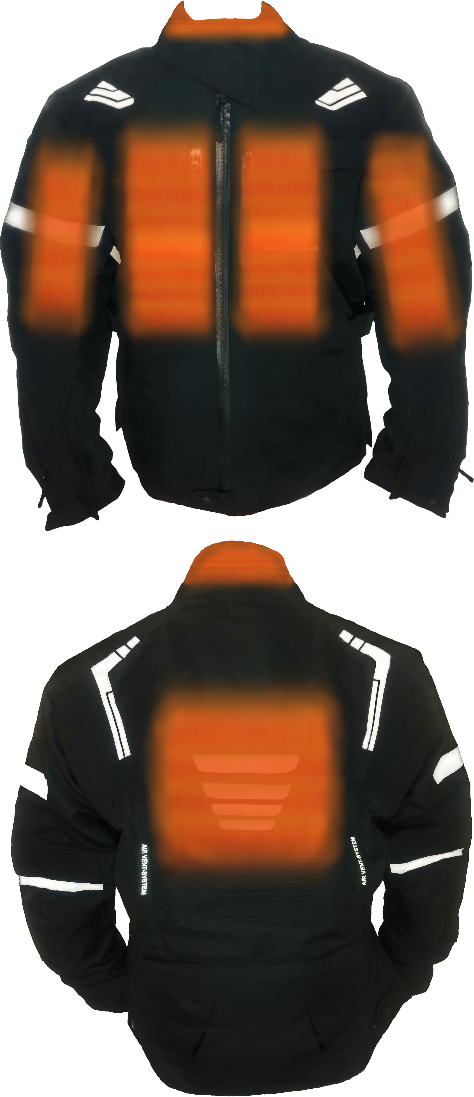 - Heating elements within the removable jacket liner in the chest, back, arms & collar