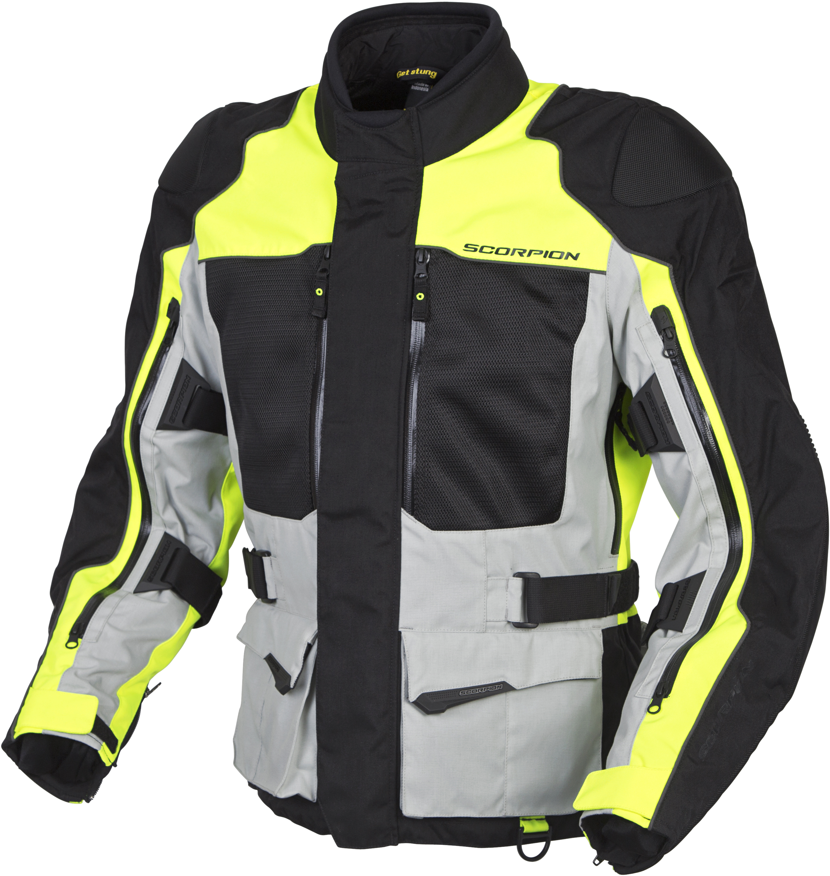 Men’s textile all weather touring jacket with zipped vents and removable waterproof and thermal liners.