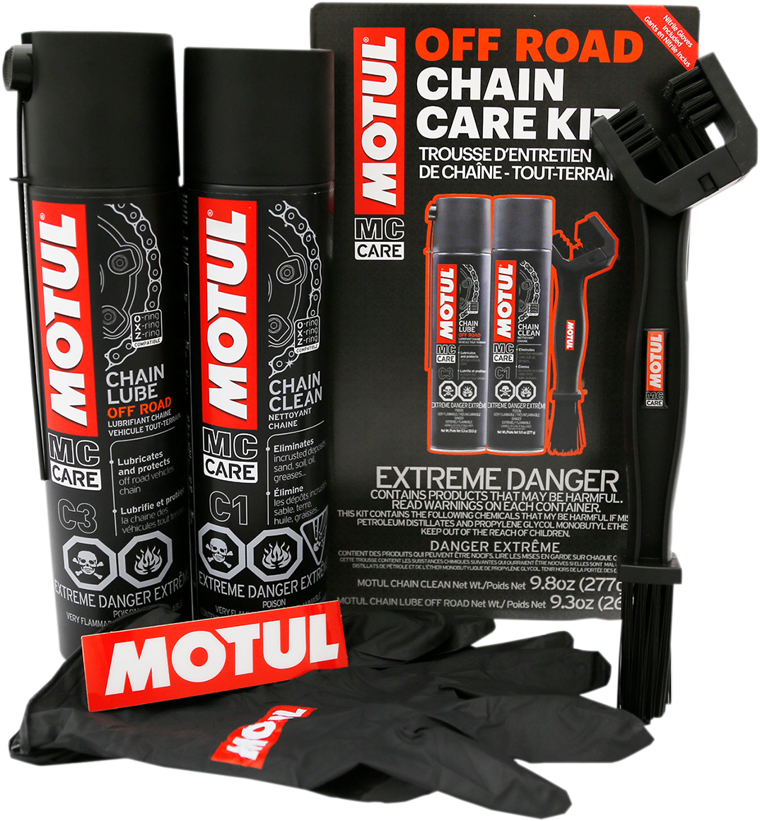- In addition to the appropriate 9.3 oz aerosol can of lubricant, each kit includes a 9.8 oz aerosol can of Chain Clean, chain brush, black nitrite gloves and Motul sticker