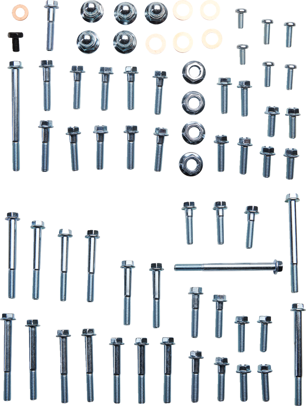 - Engine fastener kit comes with modern dimpled flange bolts; with a bright zinc finish, these fasteners last long and give a clean, updated look to any engine