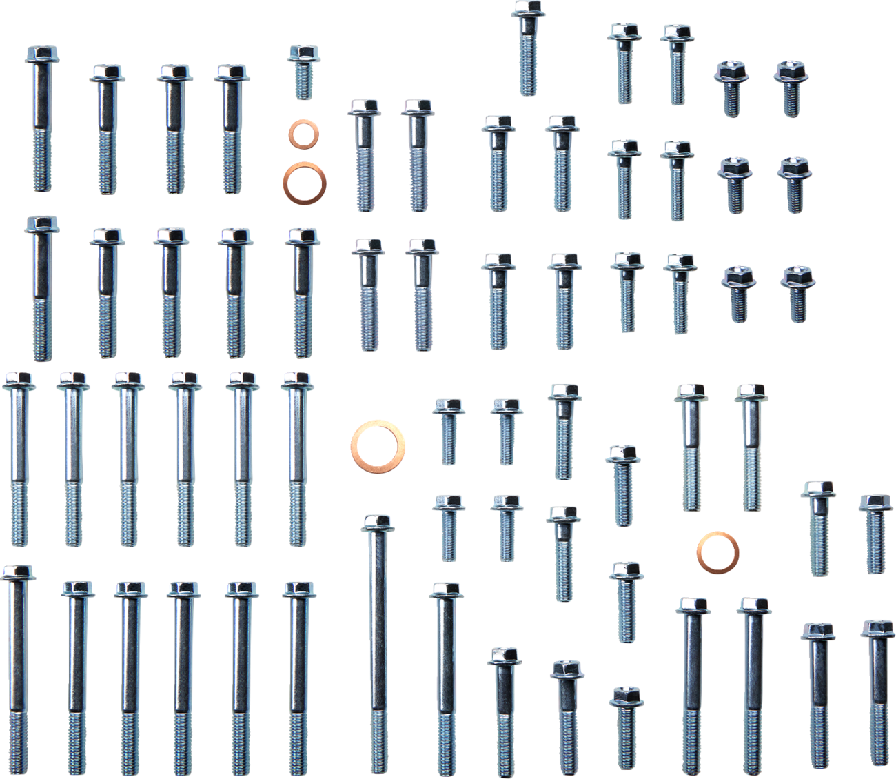- Engine fastener kit comes with modern dimpled flange bolts; with a bright zinc finish, these fasteners last long and give a clean, updated look to any engine