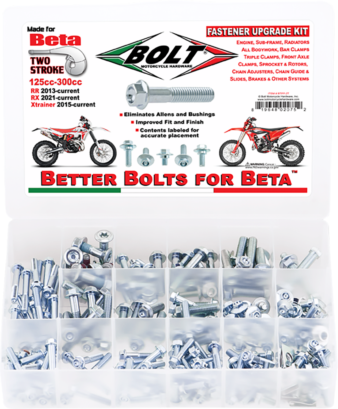 - Fastener upgrade kit for Beta is a comprehensive kit that covers: engine, body work, bar clamps, triple clamps, front axle clamps, sub-frame, sprocket, rotor, radiators, chain adjusters, chain guide and slides, brakes and more