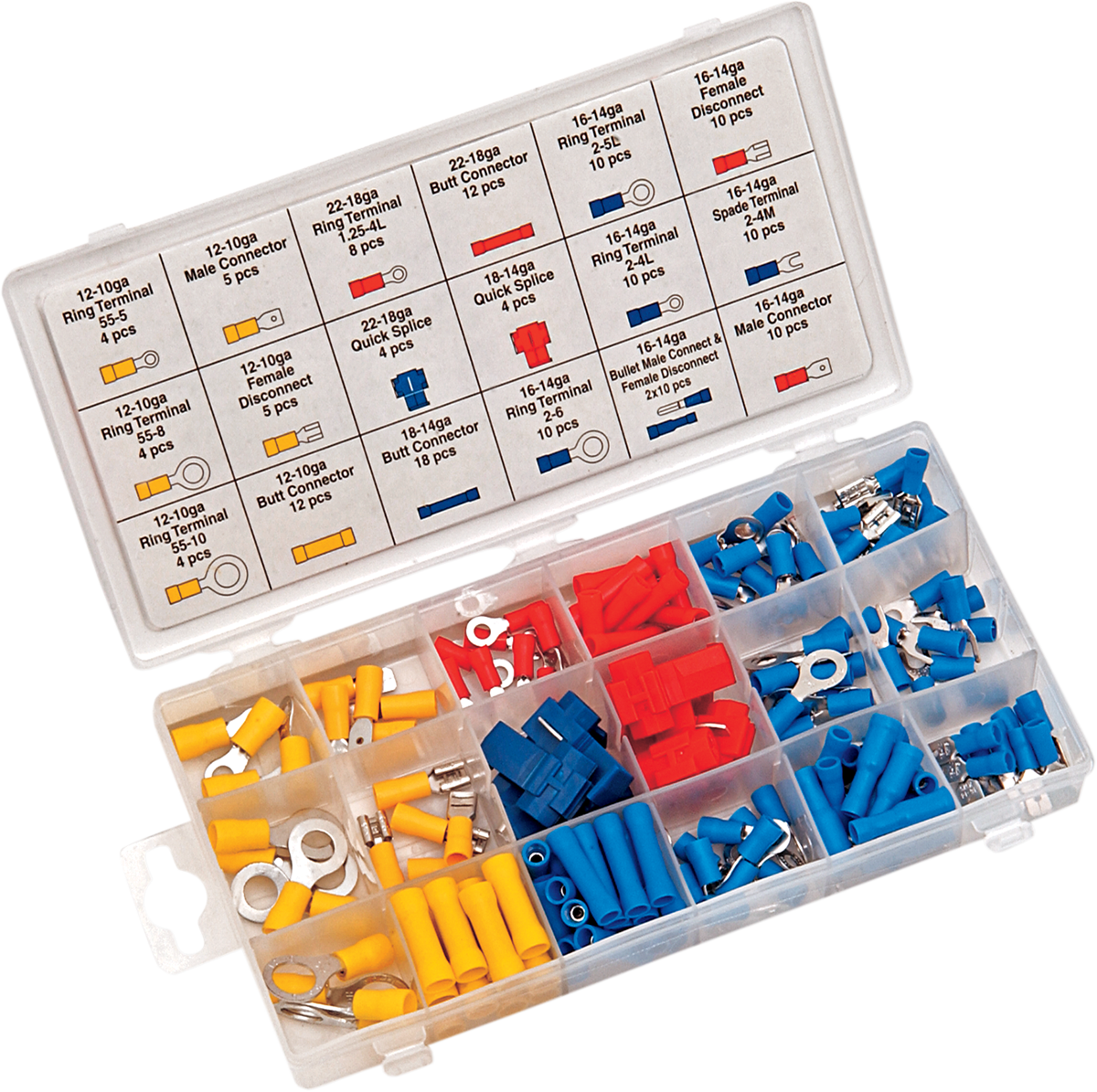 - Assortment of crimp-on wire terminals and splices for any electrical job in a resealable plastic case